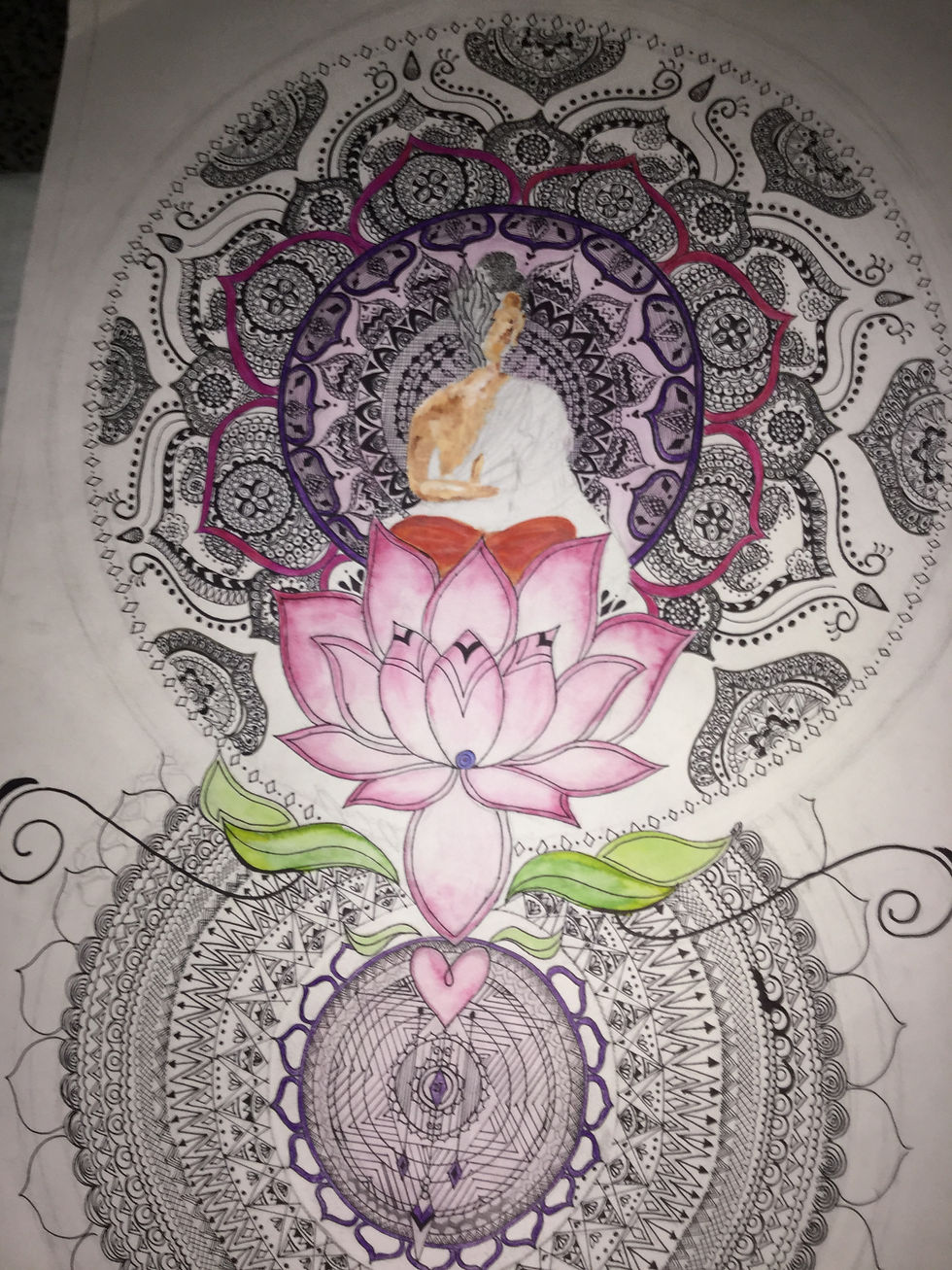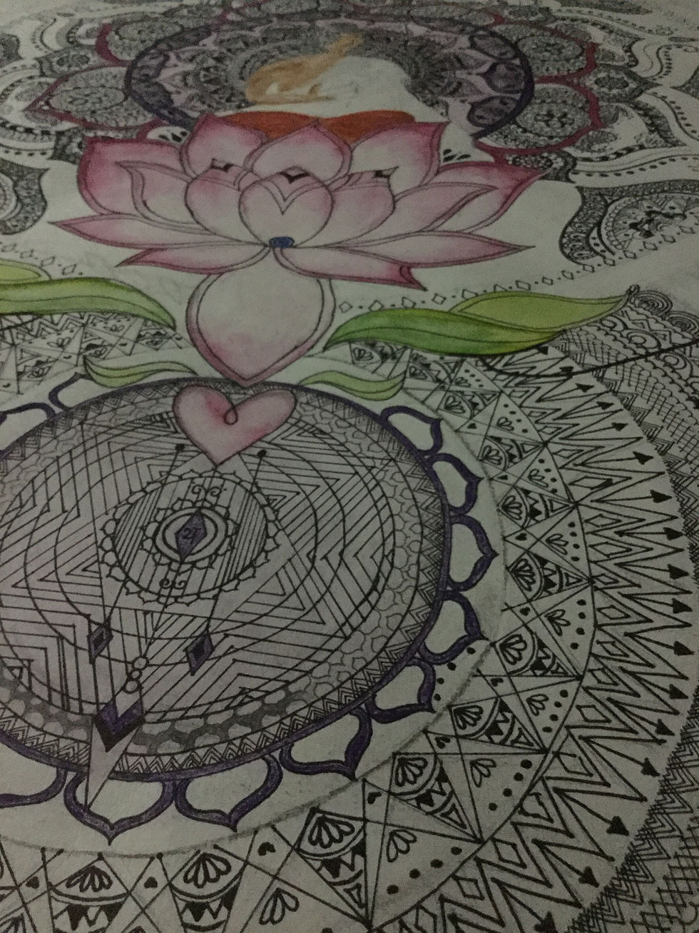 About its symbolism the bigger circle symbolizes the crown chakra of Buddha and the smaller one made with mandala art symbolizes the heart chakra the Buddha's face which is partly covered with leaves how its peaceful mind and the interlaced circles show the synchronization of heart. This is still incomplete and i will soon be posting the complete version!
